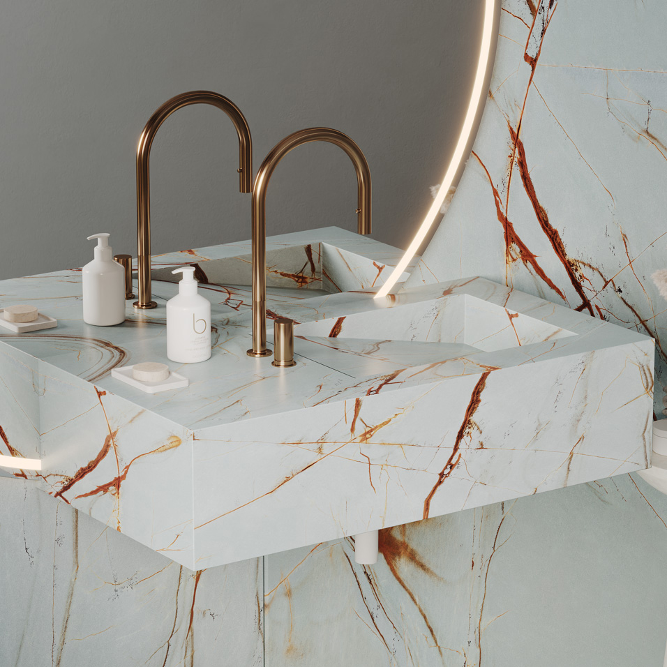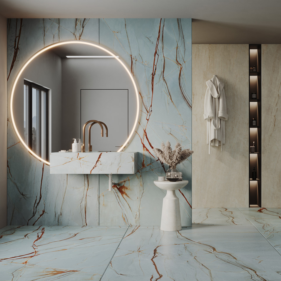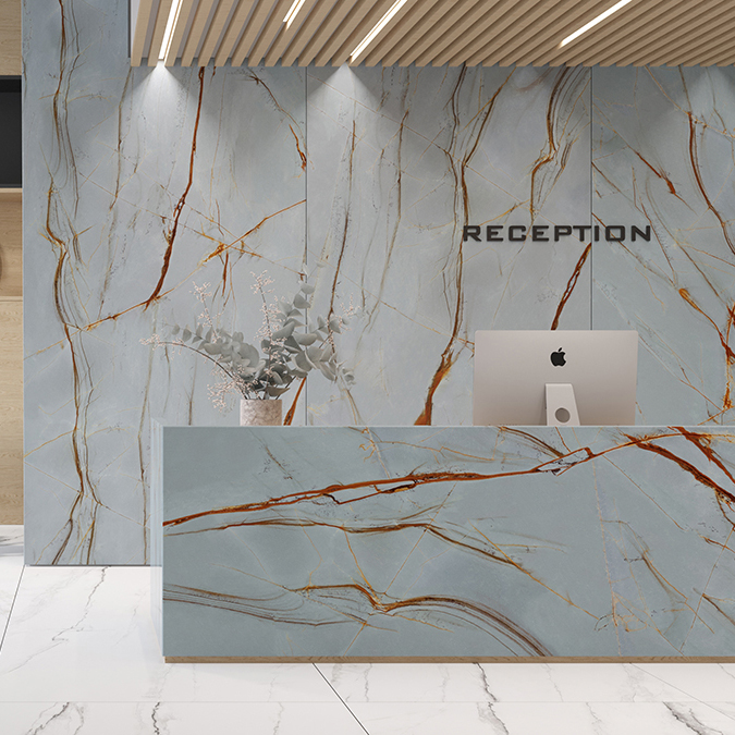 Blue Roma Porcelain Slab, is another quartzite treasure from northeast Brazil. Its spectacular blueish-grey background with criss-crossed and graceful copper veins represents an enriched surface.