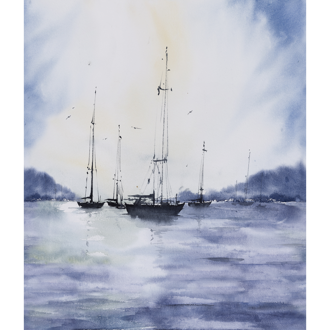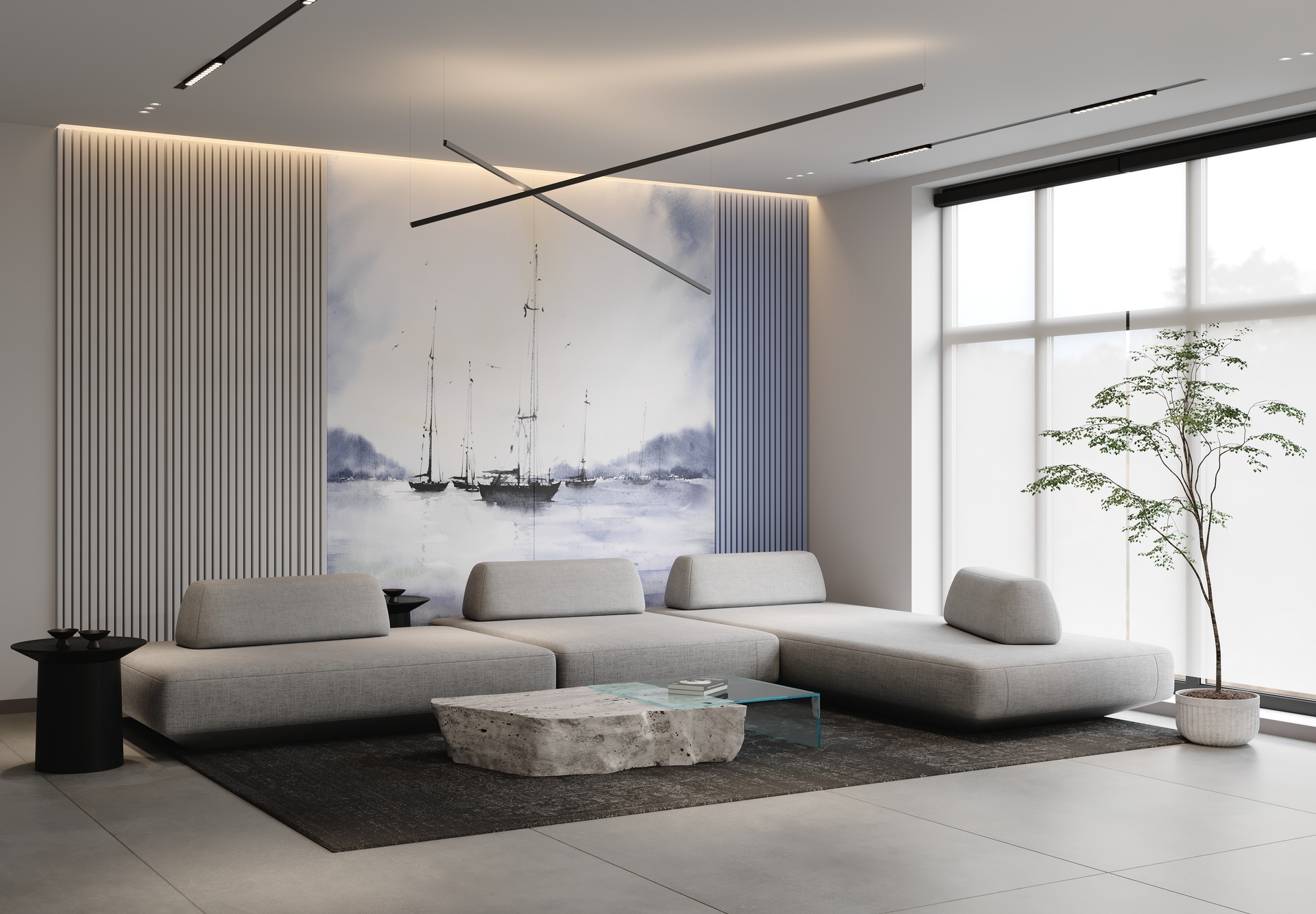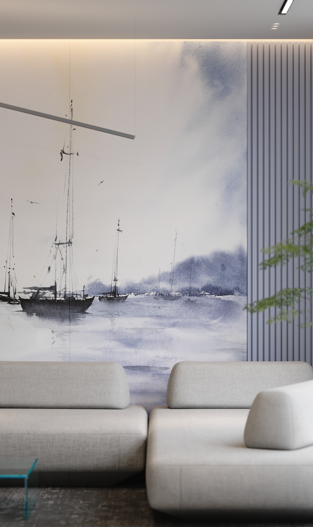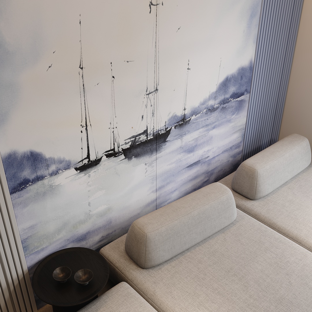 Preponderating the waves, propagating an imposing yet peaceful and blue atmosphere over the horizon. This conception is one of the painting designs inspired by the concept of the sea and seafaring. The high height and double-slat composition of this conception make it suitable for high ceiling deep halls to impose a sense of stillness.