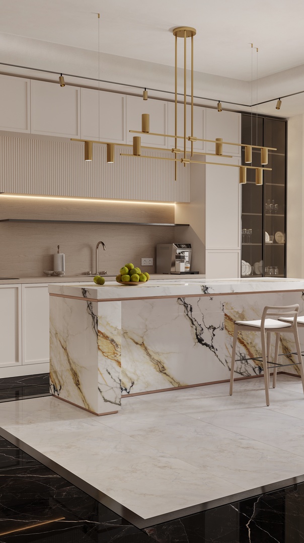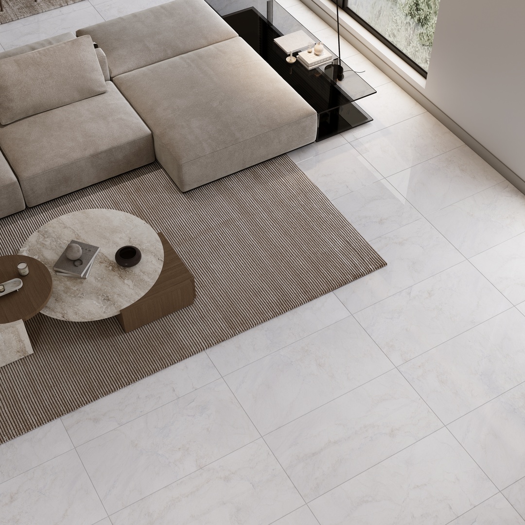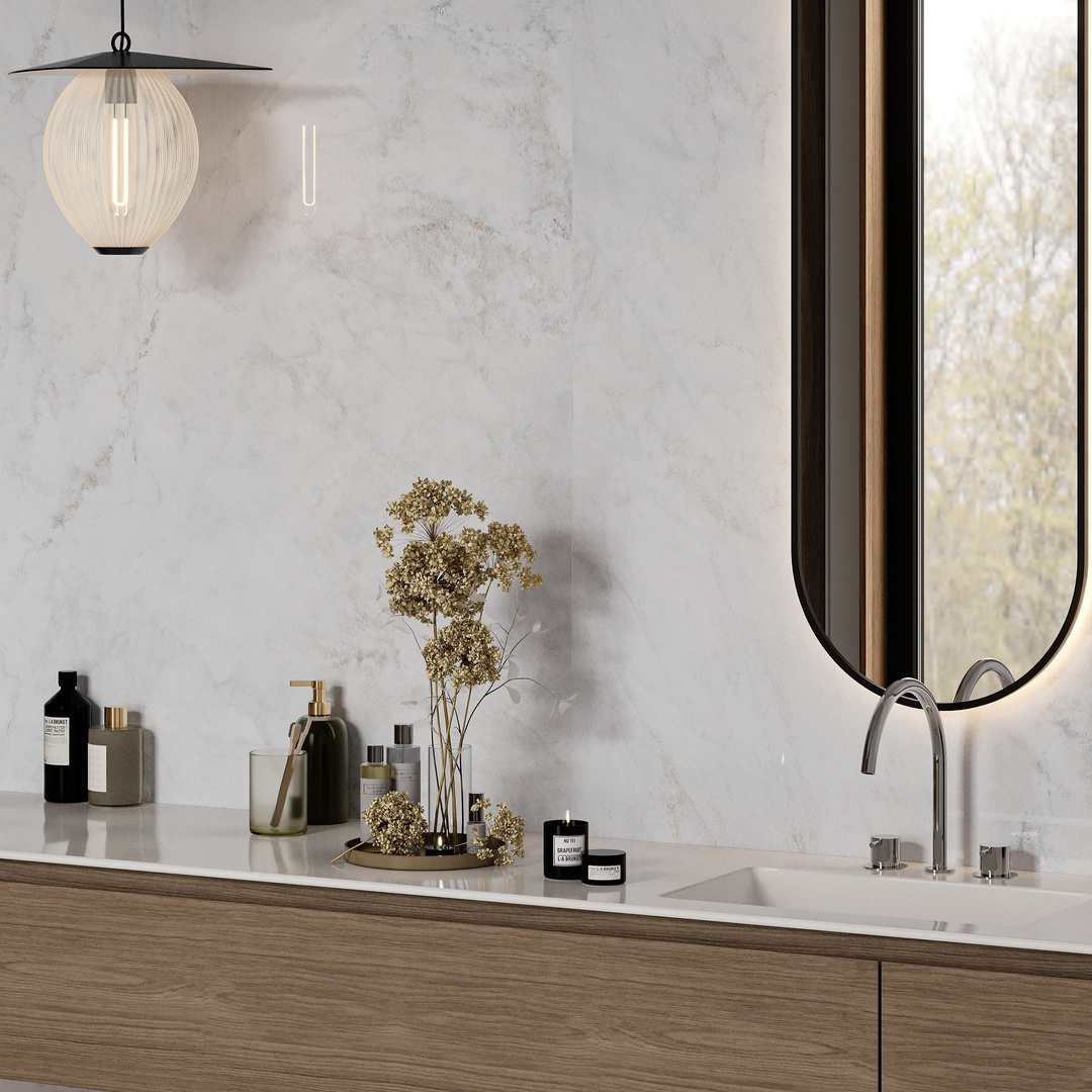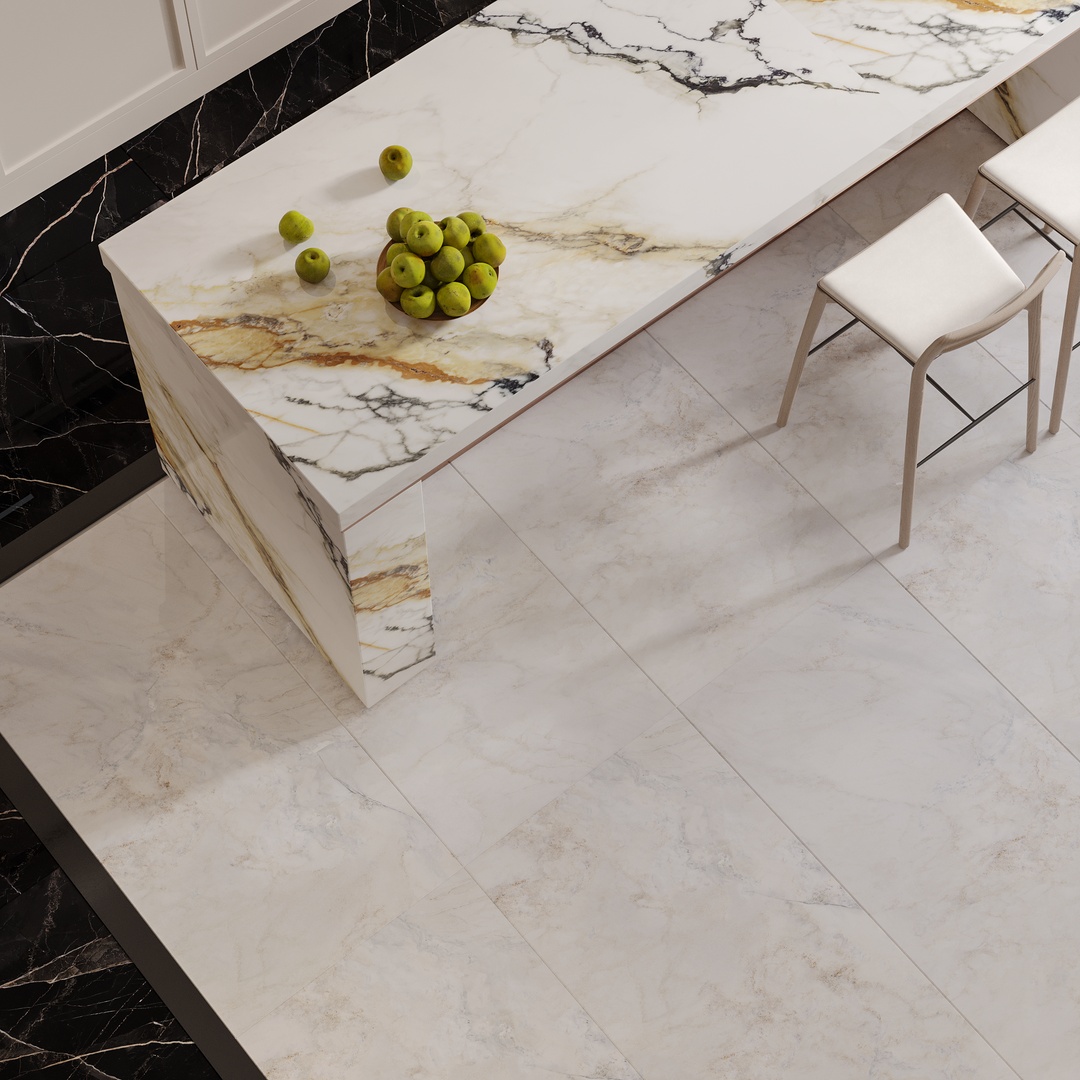 Euphoria’s elegant white background is adorned with dancing gold and blue shades fading into the misty backdrop. The milky soft surface of Euphoria creates a minimal and soothing sensation, while its crystally texture adds depth to the design structure, making it a standout choice for architects and interior designers who are seeking to create graceful and harmonious interiors.