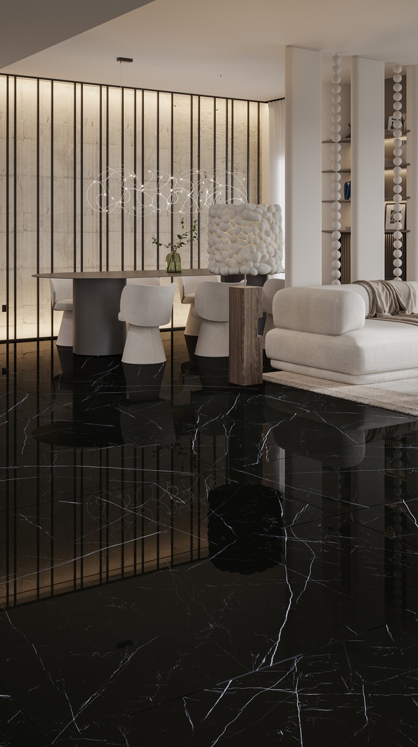 Nero Marquina embodies the intense elegance of black marble. With ultra-thin white veins running across an extremely black surface, Nero Marquina by PMA is a full-body porcelain slab suitable for ultra-sophisticated settings. Its visual perfection delivers a truly unique impact.
