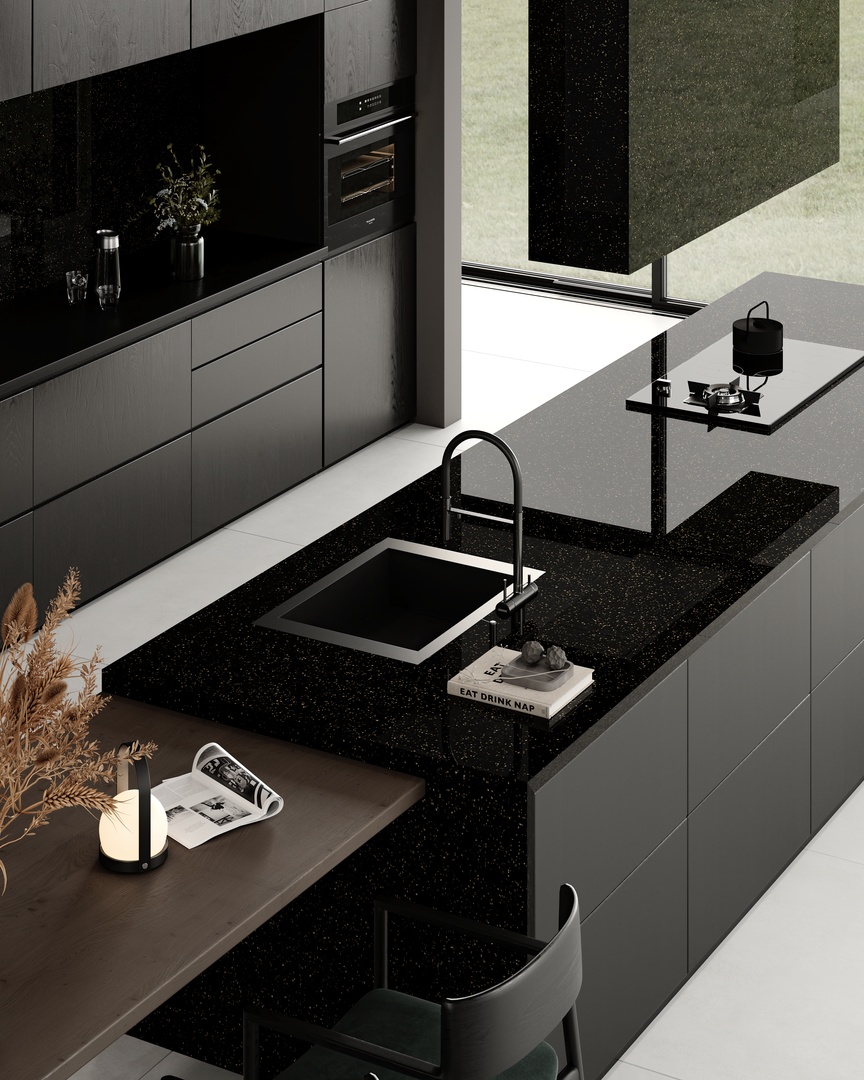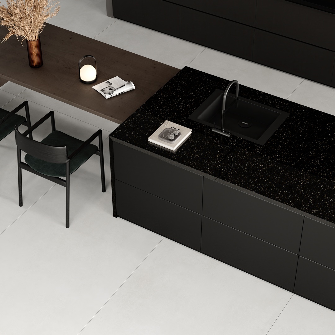 Imagine a night sky captured on a surface, where deep black shimmers with the subtle brilliance of distant stars. The polished finish reflects light in an almost otherworldly way, casting a warm glow that adds a touch of luxury to any space. This design envelops your space in mystery and allure, as if every tiny glimmer holds a secret waiting to be discovered. It’s an invitation to experience elegance in its most profound form.