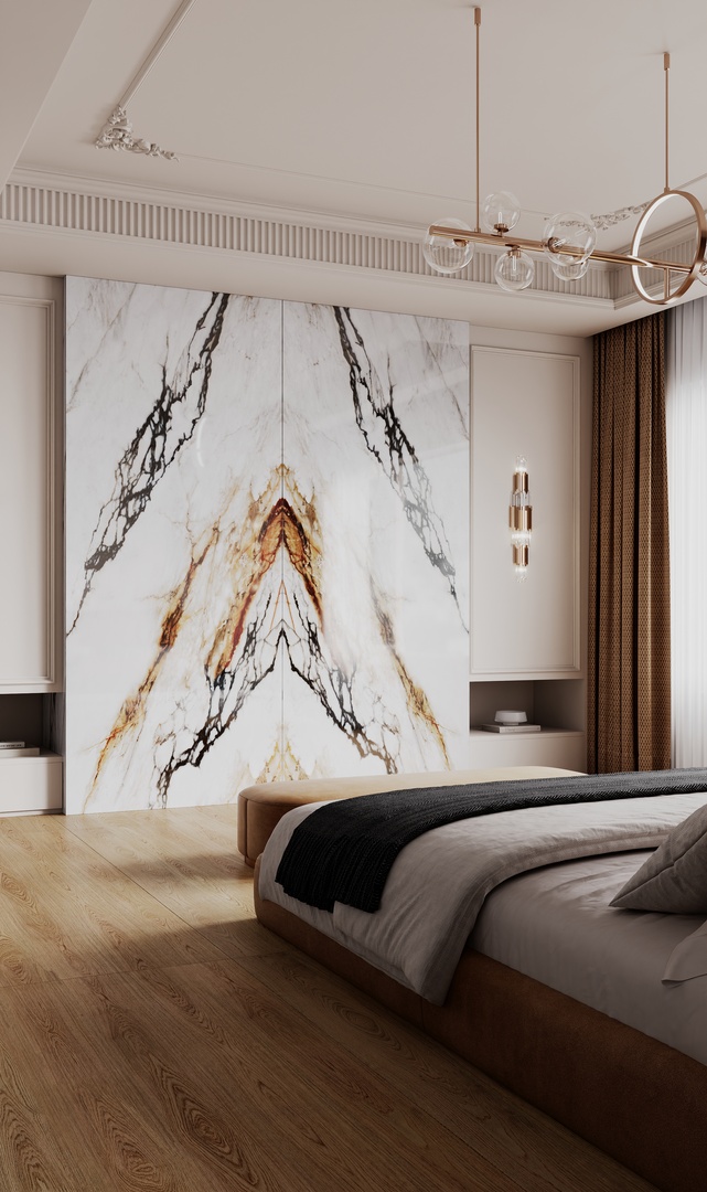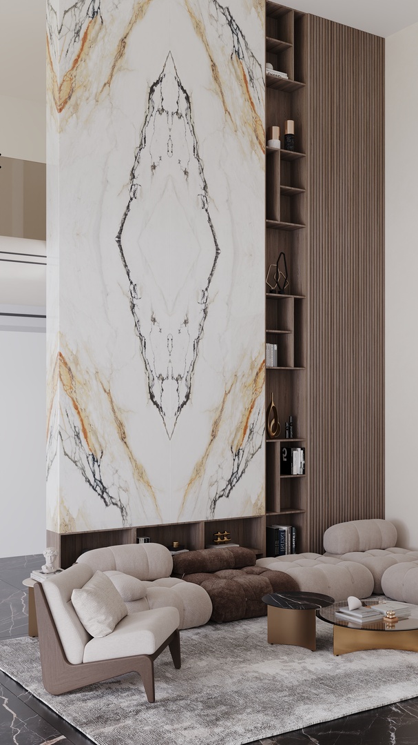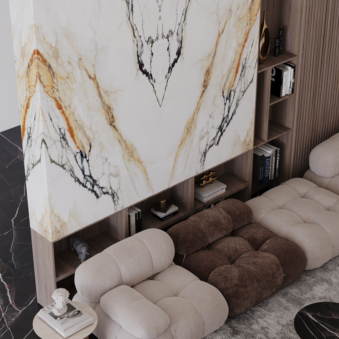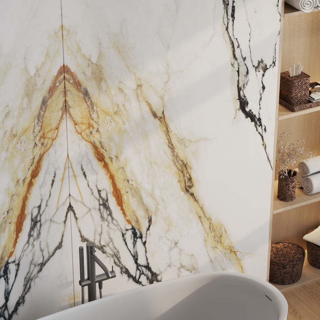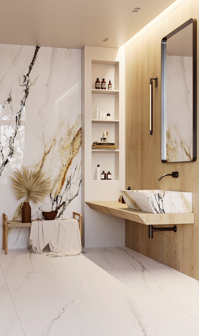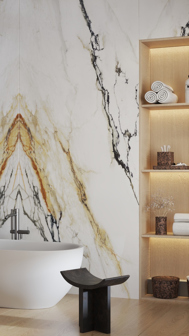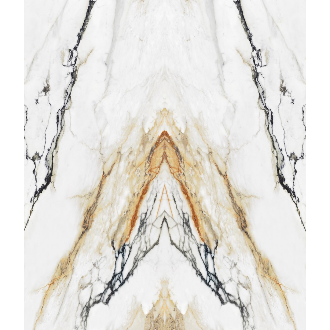 VENA VECCHIA Bookmatch is a remarkable natural stone design that boasts an elegant ivory appearance complemented by a delicate combination of caramel and merlot veins. Golden flecks interspersed throughout the stone add a touch of glamour, making this marble a timeless classic with high decorative value.