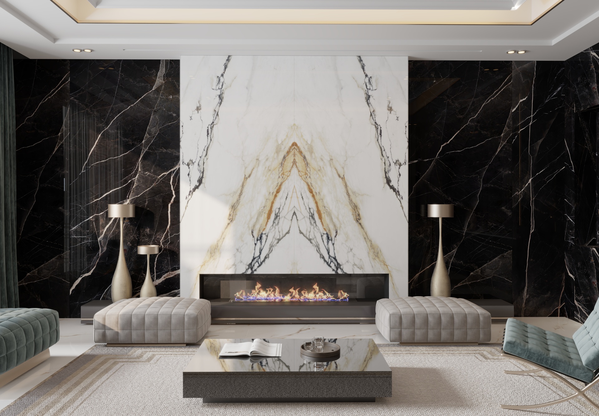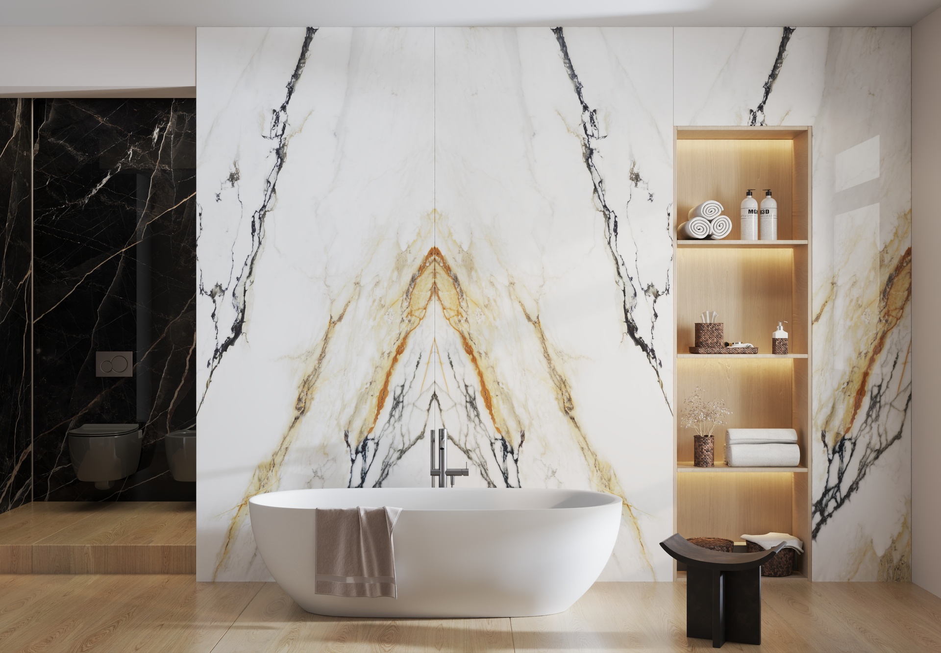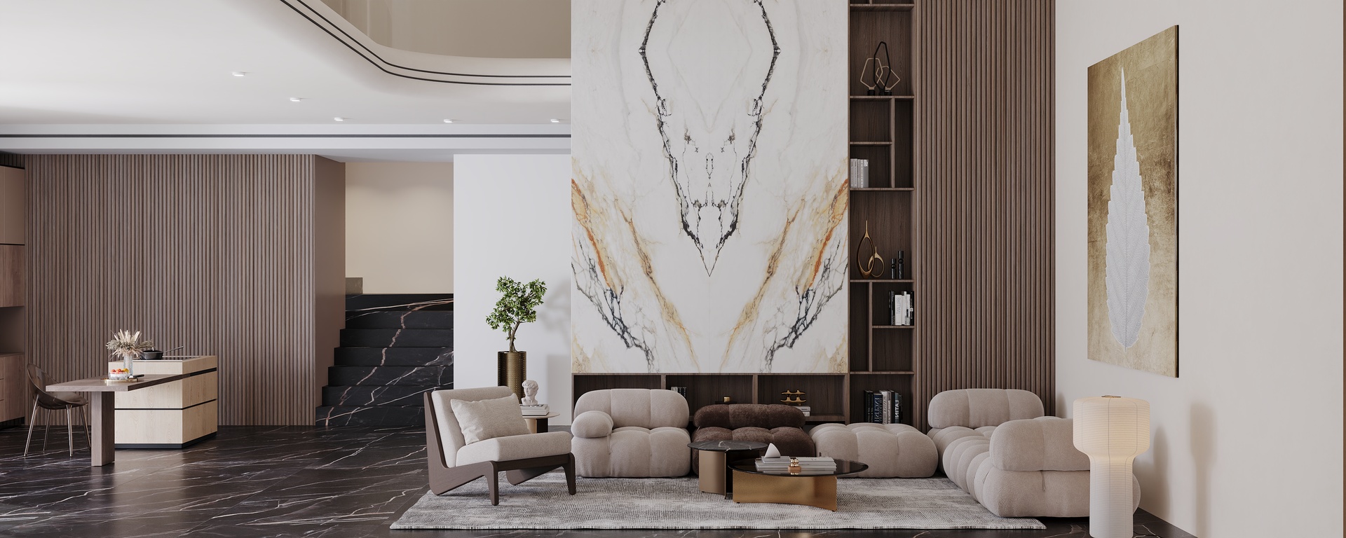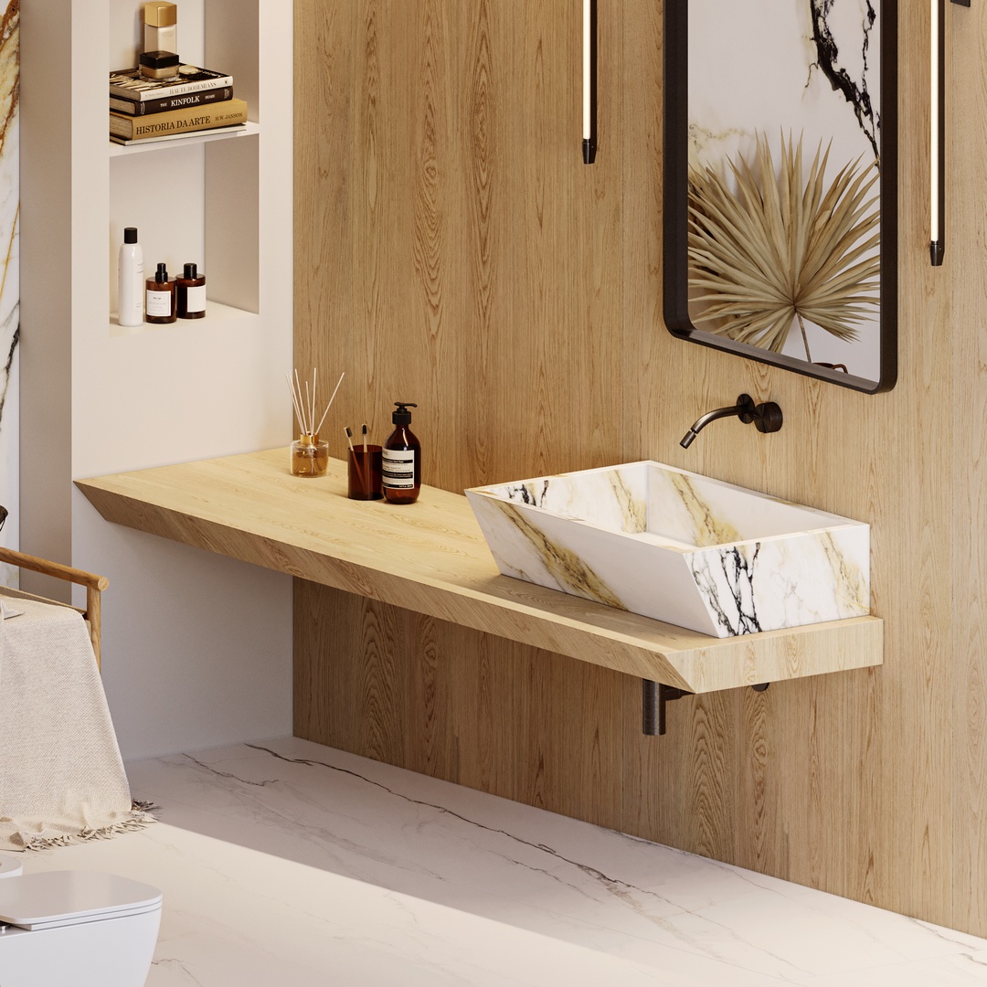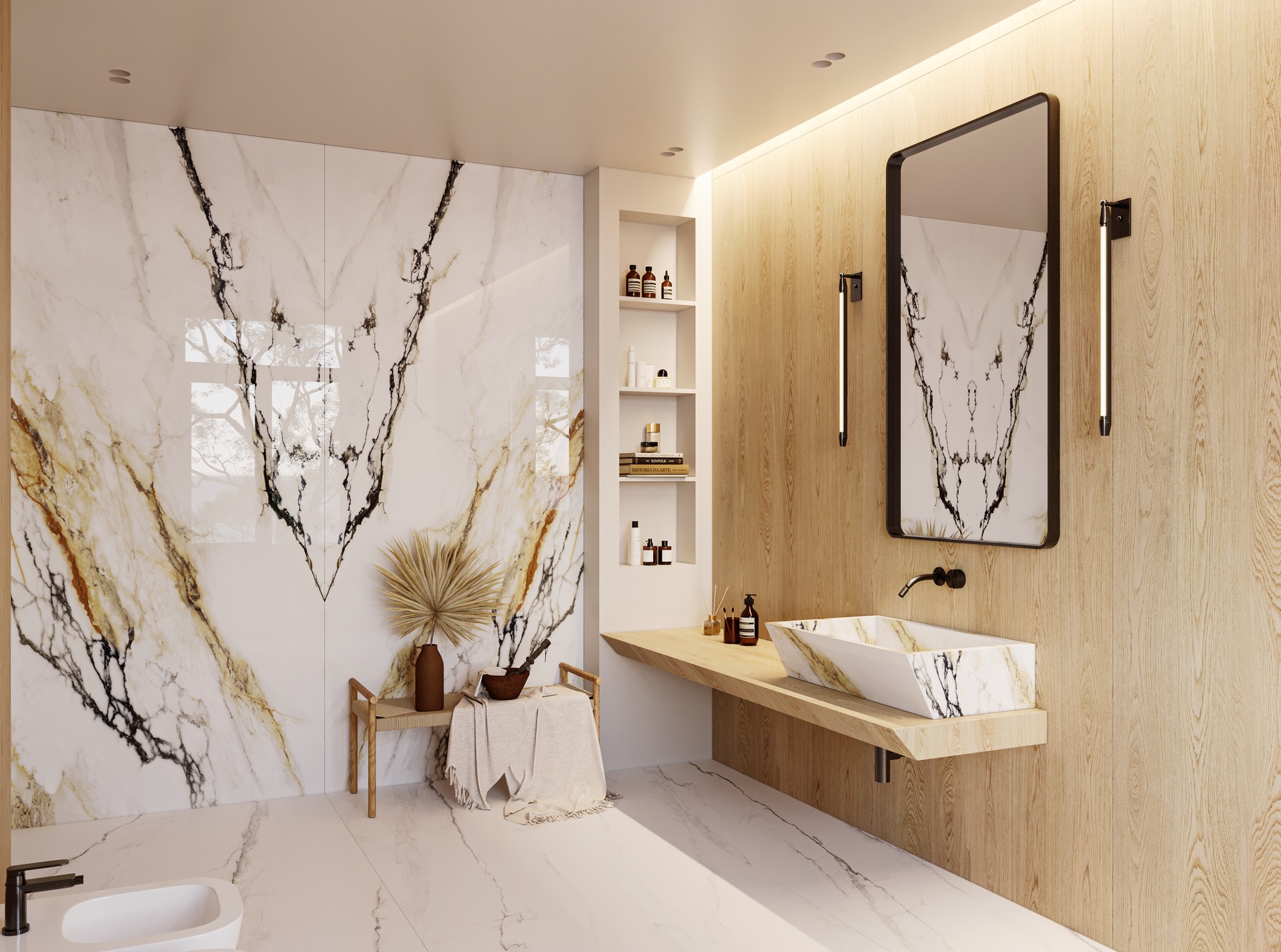 VENA VECCHIA Bookmatch is a remarkable natural stone design that boasts an elegant ivory appearance complemented by a delicate combination of caramel and merlot veins. Golden flecks interspersed throughout the stone add a touch of glamour, making this marble a timeless classic with high decorative value.