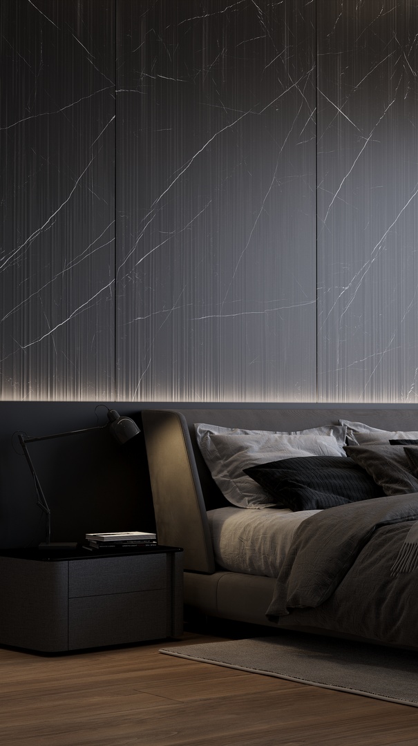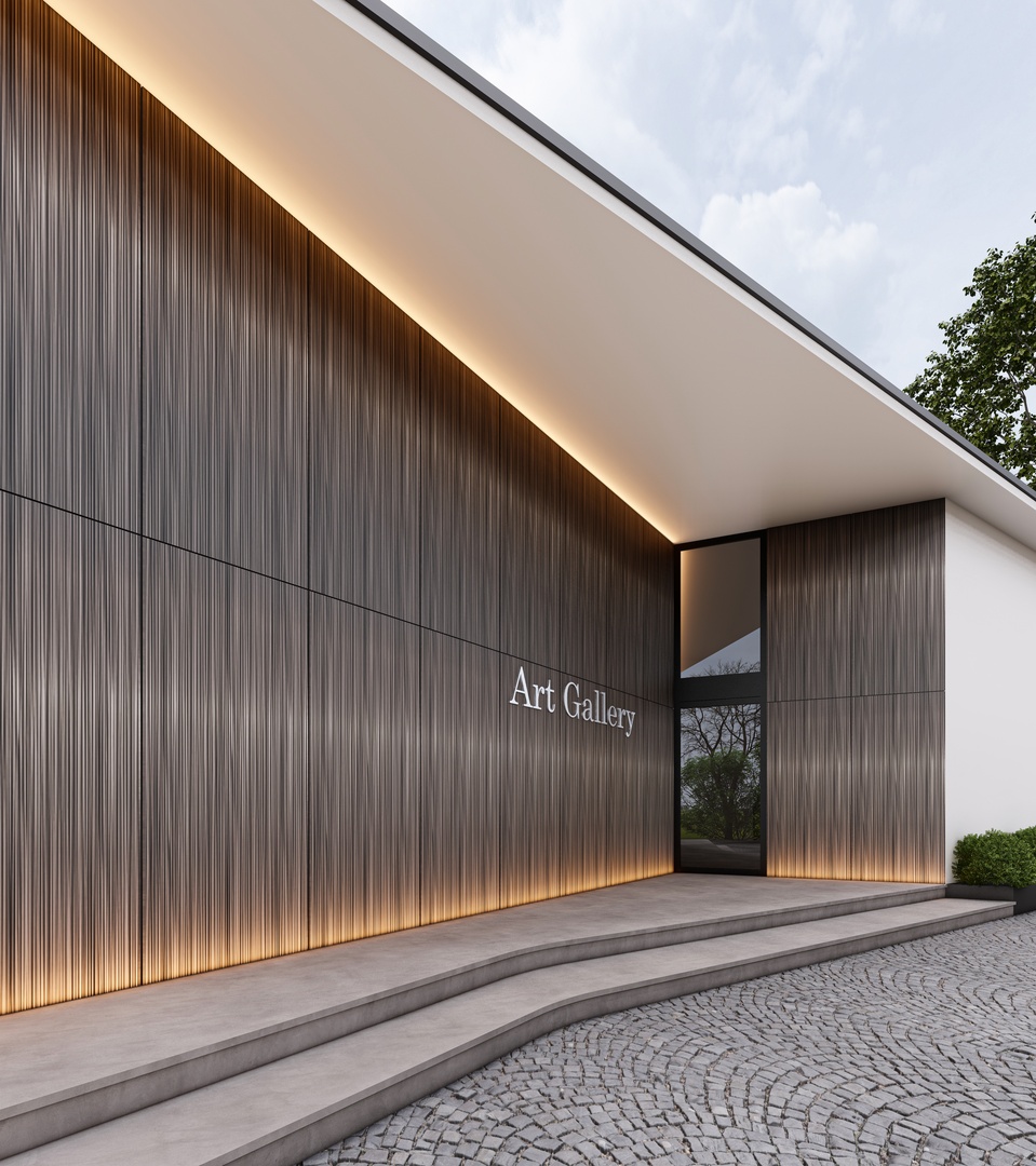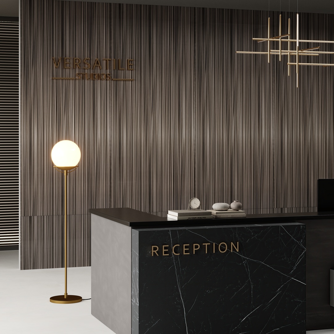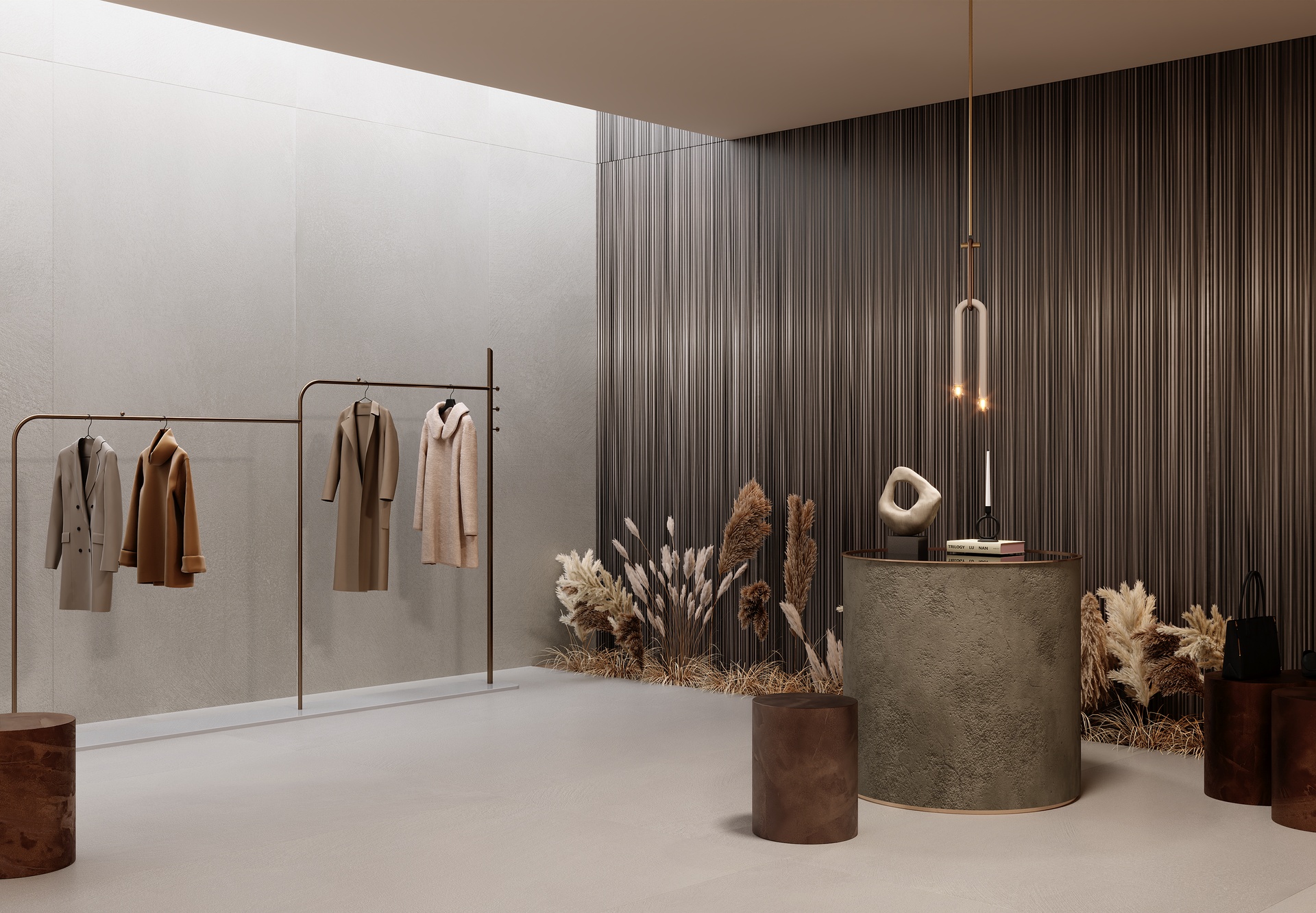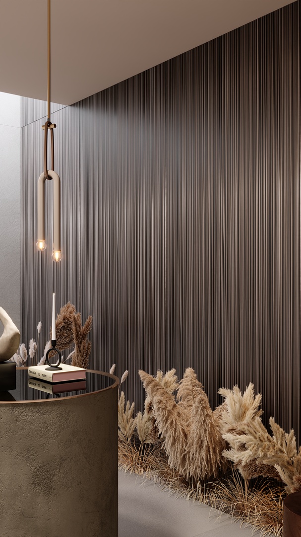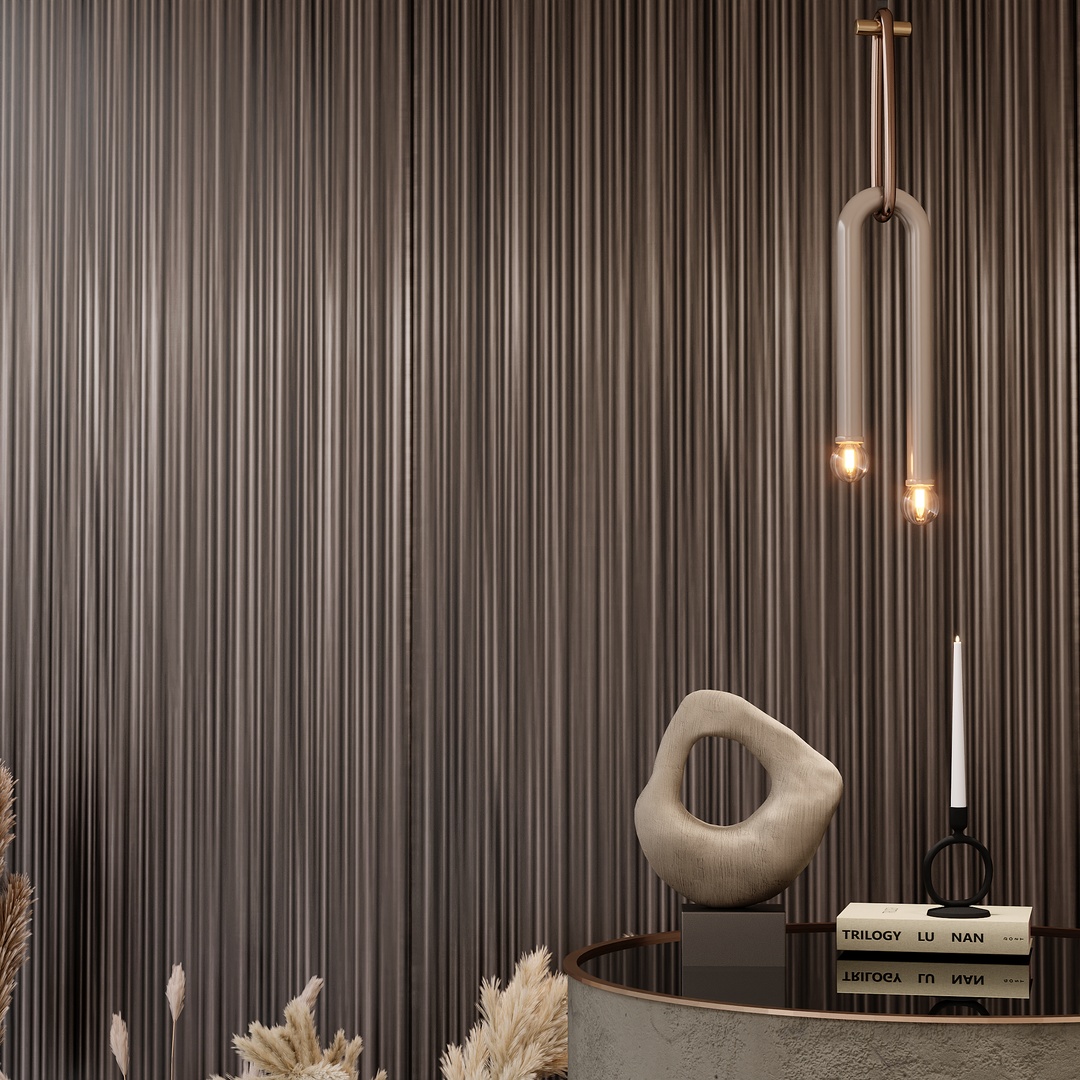 Metal characteristics such as radiance and resistance evoke a sense of strength and luxury, while the metallic surface creates a subtle shine throughout the space. The striped pattern of Metal’s punched relief is trendy, elegant, and modern. Creativity in this design comes from the combination of wavy lines in the relief with the dancing reflections of light on the uneven surface.